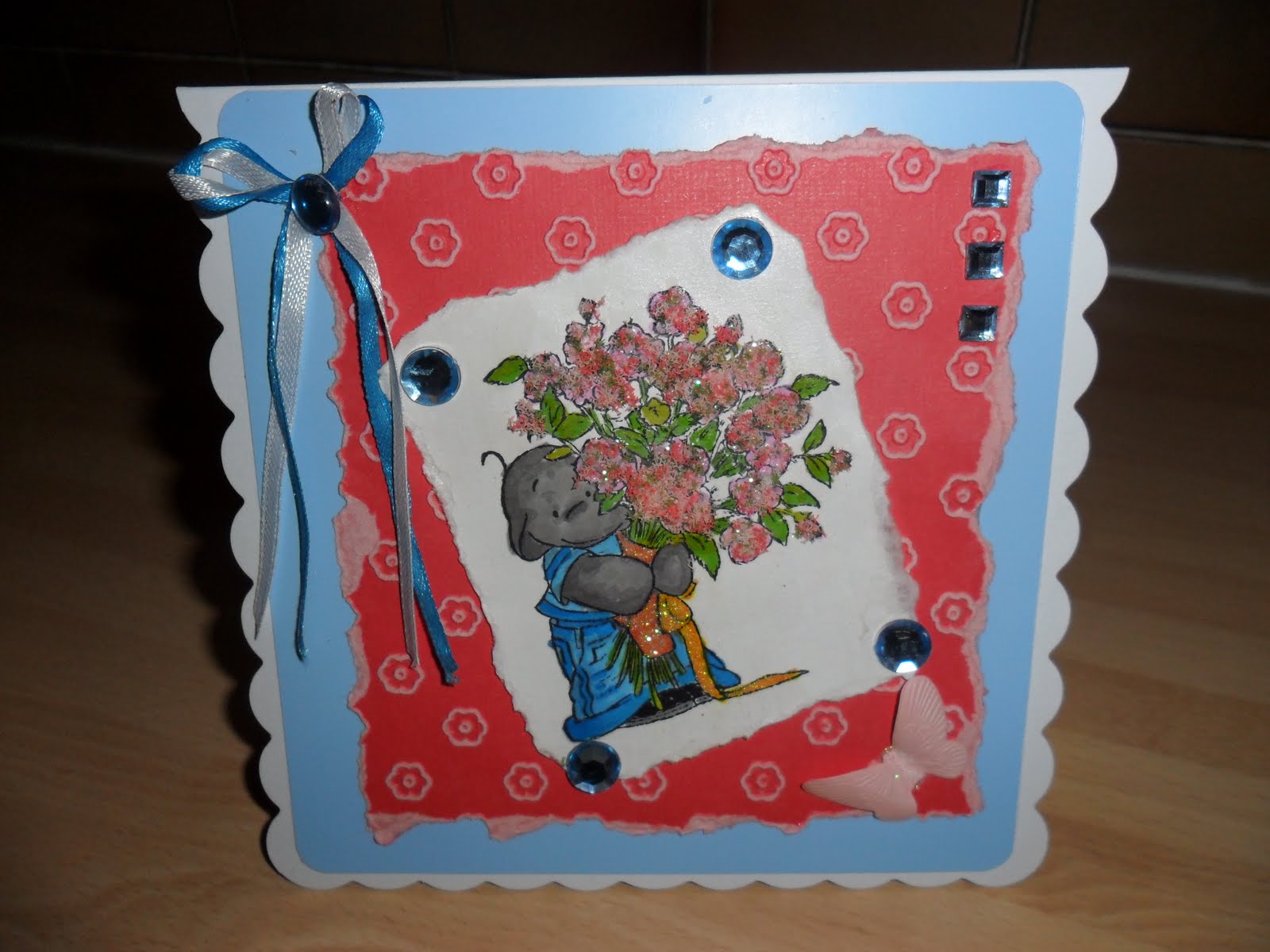 Paper doily was used to frame the die cut oval, used pro marker duck egg blue and added self adhesive gemstones to decorate and attached all to topper using glue pen, flowers for embelishment used to finish off design then attached completed topper onto the card using finger tape.