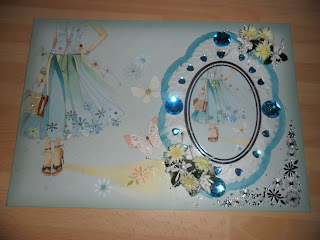 Using The Window Of The Hearts collection by Hunkydory I used an A4 topper blinged it up with fine glitter, used a die cut oval image from the collection and again blinged it in the same way.