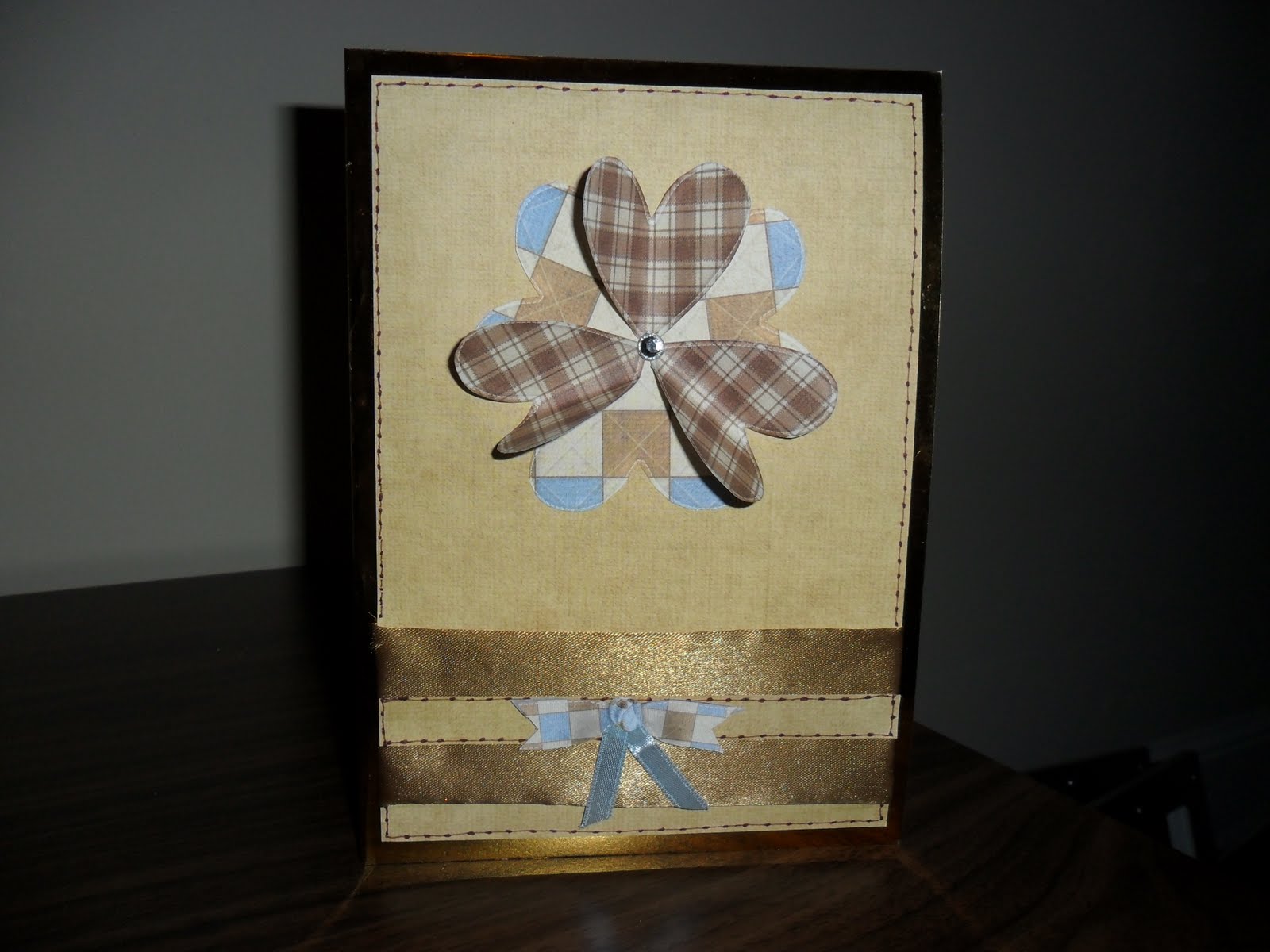 Used A4 cream card 250gsm, mat and layered with gold mat miri card, made two frames and embossed the smaller frame round the edges. Printed design several times from My Craft Studio, cut out and layered each element, one on top of the other using silicone glue to give dimension everything else was attached using finger tape. A punch was used to enable me to thread ribbon through the holes (this gave a nice effect I thought). Added sentiment, jewels and glitter for effect.