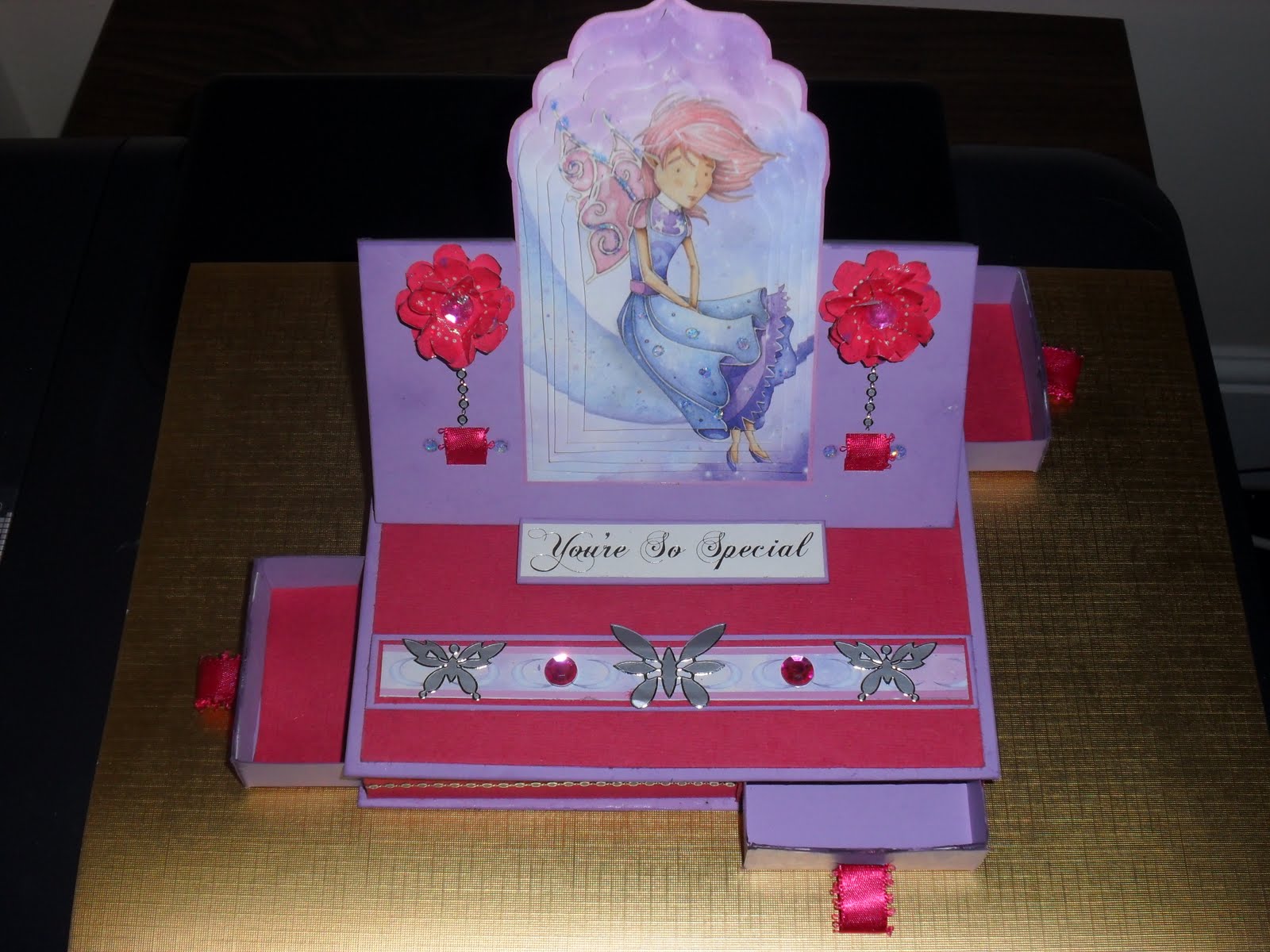 I used pastel purple cardstock and a deep pink card, using the envoboxer, i scored and cut all sizes and made up using a wet glue to stick. i pirimaged the main design, used old wrapping paper to make flower embelishment added clear stickle to design embelished using gem stones, ribbon for handles, peel off stickers and added sentiment all attached using tape pen and sticky dots.