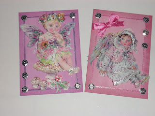 Decoupaged and shaped each of the Poppet Faeries to give dimention to the images use pinflair glue gel, add ultra fine flower soft to highlight area's add pinflair craft glaze to wings and the flowers, use sequins as brads and attach with pinflair glue gel i finished off with a pink bow on one of them.