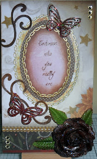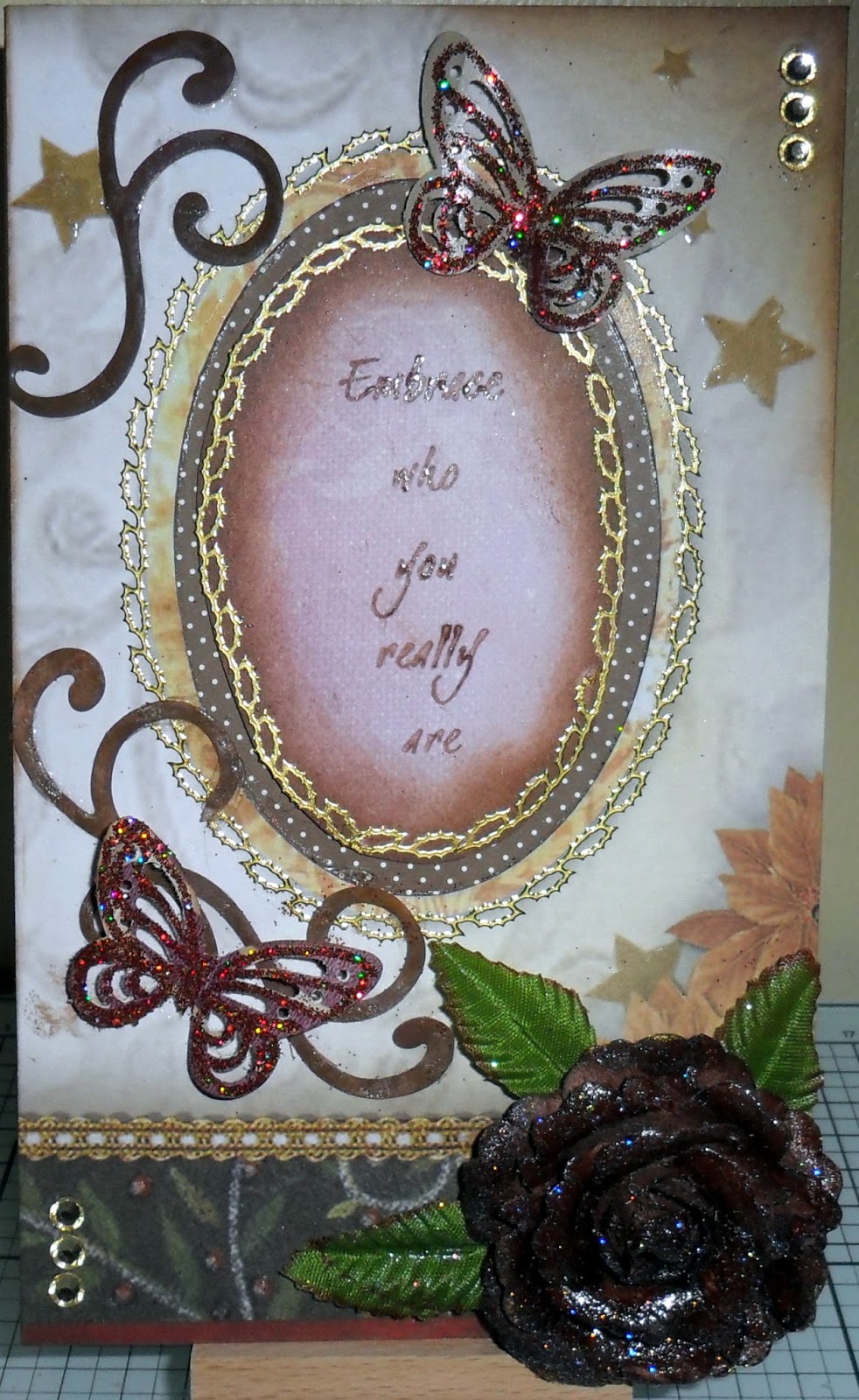 Added and placed two die cut butterflies which had been dipped in copper tones glitter and in the bottom corner added the rose also from goody bag swap, before attaching i sprayed the rose with spray and sparkle from crafters companion, added the leaves and attached with silicone glue. I inked the top right corner to blend in with the rest of the card and added gemstones to finish off.