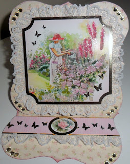The shaped card is from Kanban i used one full one and one half of another, scored and folded the first full card across the middle where the points are, then attached the half card to the one i had scored but only attached from the score line to the bottom of the card. Covered top panel and the bottom panel with backing paper cutting the shape out from the back, butting scissors up to the shaped card give's a neater finish. I added a border strip along the bottom for a stopper to keep easel upright.